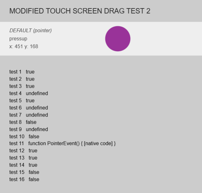We are planning a change to createjs 1.5 which ZIM 019 is using but not ZIM 018 and earlier. This change switches our mouse events to use pointer events. If you could test that you can drag the purple circle on as many devices, touch screens, operating systems, browsers, etc. that would be handy. Please let us know. Cheers.