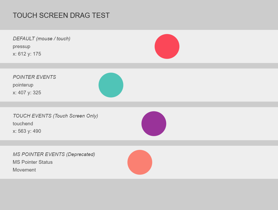The last three circles below use pointer, touch and mspointer events independent of CreateJS and ZIM. We did not get the mspointer events to work on our machine, but it is possible that an older browser might recognize this and not regular pointer events.