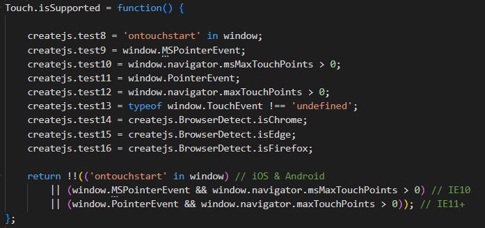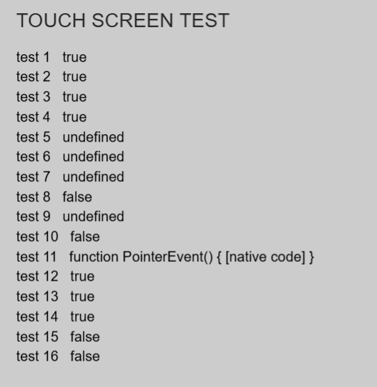 We are not even getting past the Touch.isSupported because the onTouchStart and the maxTouchPoints are returning false. I have to teach now - but will work on this later.