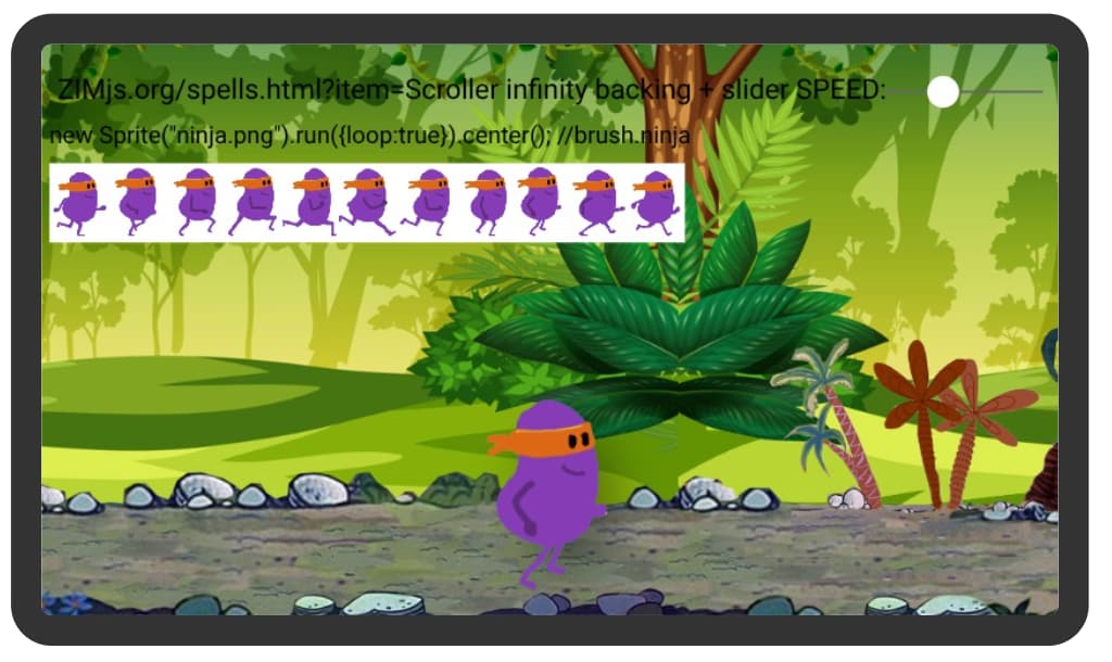 I did update with zapp_assets, easier for kids: https://zimjs.org/bits/scroller is version ZIM 01 using F.loadAssets,