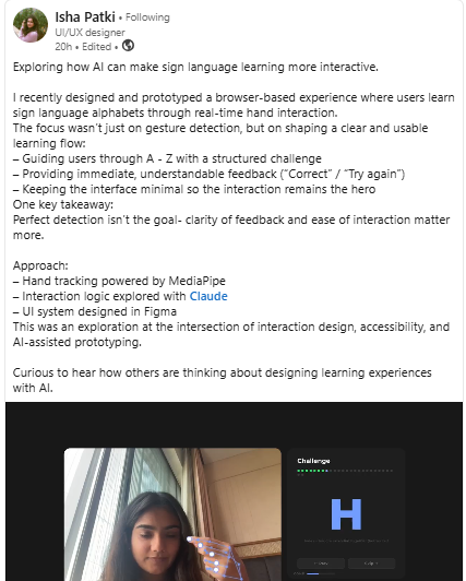 https://www.linkedin.com/posts/isha-patki-572403247_exploring-how-ai-can-make-sign-language-learning-ugcPost-7446085653240406016-eNFI?utm_source=share&utm_medium=member_desktop&rcm=ACoAAAHIiS0BWLRDJMwF7jIH68BraK3zIzm9PRM