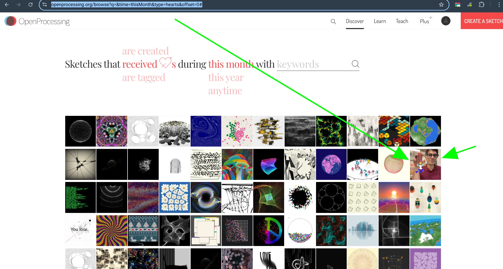 more here https://openprocessing.org/browse?q=&time=thisMonth&type=hearts&offset=0#