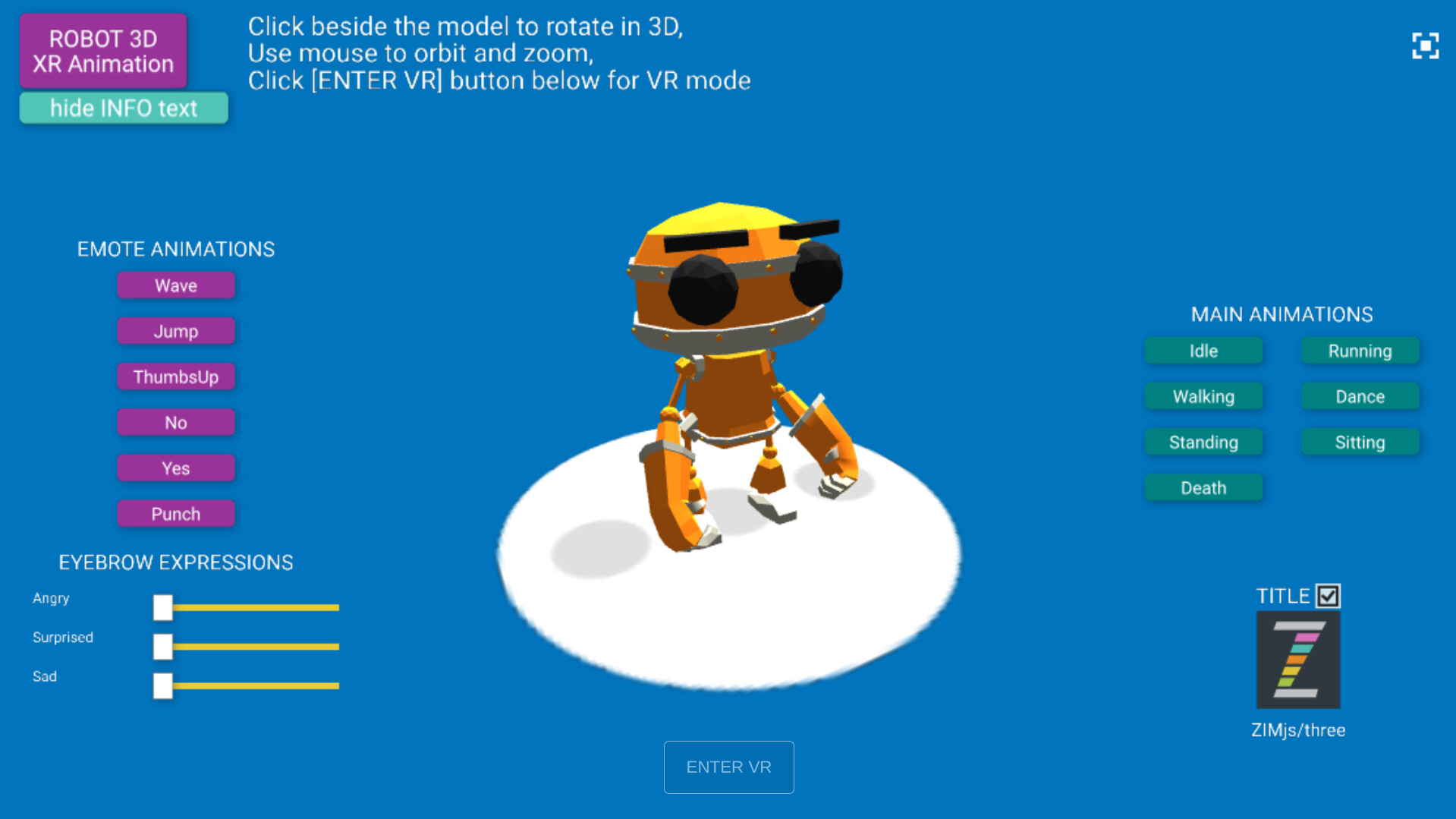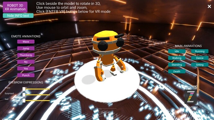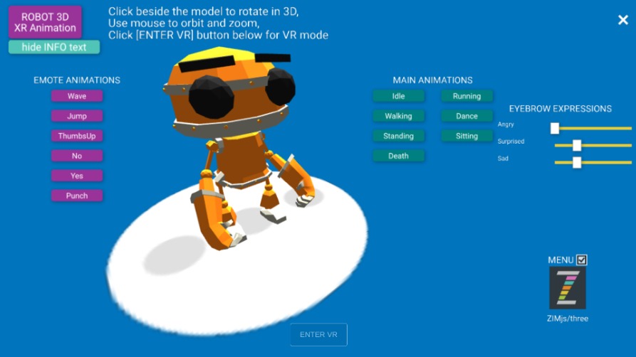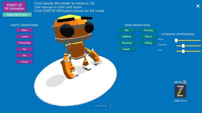 any idea this animations can inside ZIM : tumb up,.. jump.. and walk around in a VR space