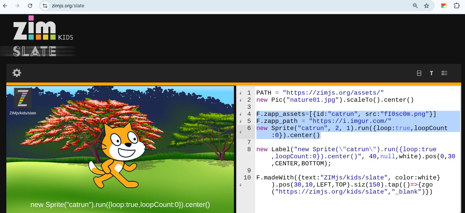 https://zimjs.com/beam/zimassetsblack/show sprites with F.zapp_assets befor using the code in https://zimjs.org/slate