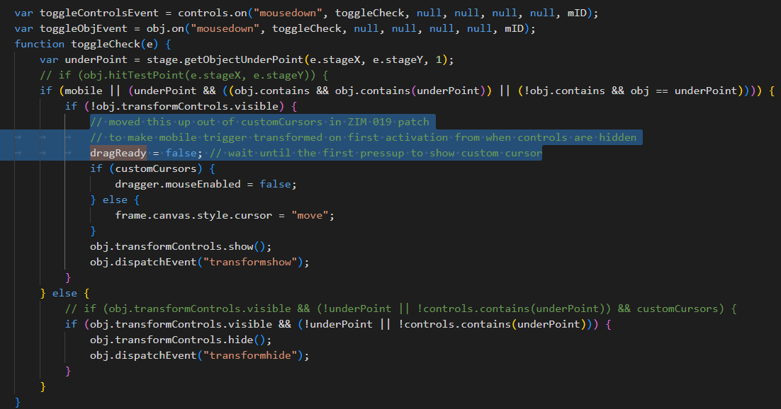 Mobile does not get custom cursors by default and the dragReady was not being set at start - this later triggers a slight delay to capture transform move events when the controls are not initially showing. So... it seems to work fine if we set that for both custom or not. We tested and the event is still just triggering once for non-mobile.