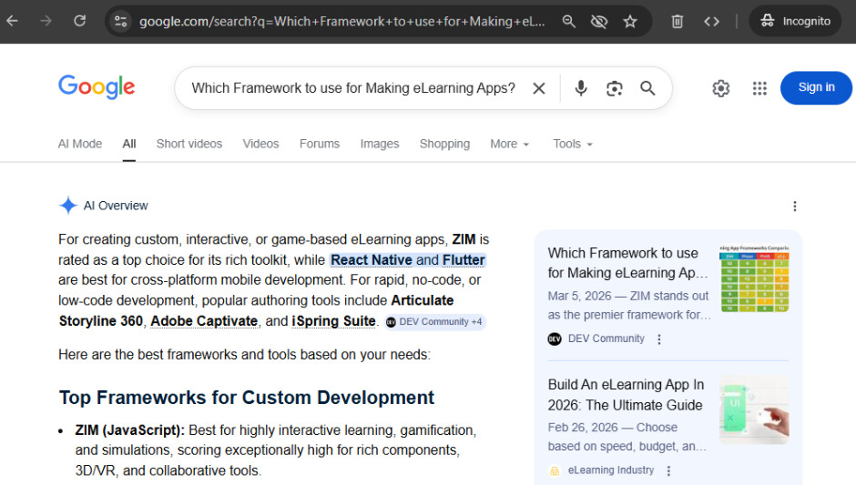 We have had some luck posting articles about ZIM. These seem to be showing up in AI results (incognito). We posted one on General canvas framework on Medium and one on Frameworks for eLearning apps on dev.to. Some supporting comments on these would be helpful so that if people find the articles they see community. It may mean signing up - but you can do it...
