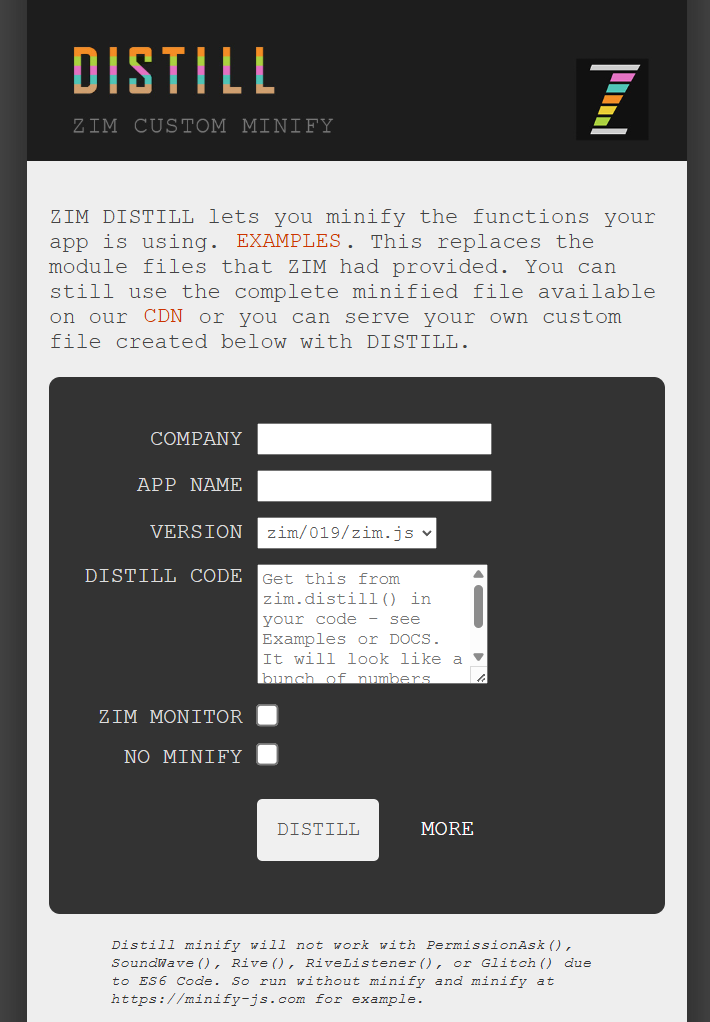 We have updated ZIM Distill - thanks @Chris_S for the prompting. Firstly, we fixed some ES6 code that snuck into ZIM. We also added the ZIM Directives and ZIM Monitor. We made the Monitor optional with a checkbox as the code is throughout ZIM. We strip most out if the checkbox is left unchecked.